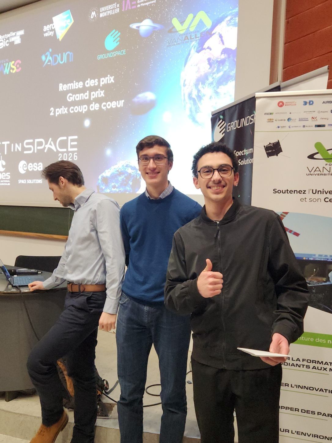 • Le prix coup de cœur du jury est attribué au projet Nexus&Space. Cette équipe a imaginé une solution de standardisation « Plug & Play » pour les satellites, composée d’étudiants de Polytech Montpellier filière Microélectronique et Automatique -MEA, 1ère année de Cycle Ingénieur : Gibril Sahli, Ethan Huchet, Noëlie Azdad, Aurélien Goumain.